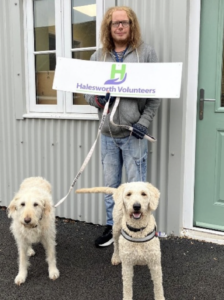 Ricky has been supported by Halesworth Volunteers (HV) and for almost 10 years has been volunteering for us, helping people with dog walking, gardening, odd jobs and more.  Ricky can often be seen walking around Halesworth with Patch, Rufus, Bailey, Aunty and Aubrey, giving their owners the reassurance their dogs have been walked and exercised, even when they can’t manage this themselves.